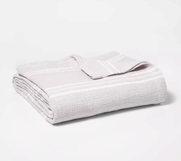 This 100% cotton blanket from Target’s in-house brand, Threshold™, is mid-weight and slightly textured. It measures 90” x 66” and comes in three neutral colors. Reason to Buy: This lightweight gauze blanket is just $30 and has an average of 4.8 out of 5 stars from 305 ratings, making it our top recommendation for an affordable cooling blanket. 95% of reviewers would recommend this blanket, with many mentioning its breathability. One reviewer wrote that it’s “the perfect lightweight blanket for those of us in sweltering summer climates.” You can use this blanket as a coverlet, thin sheet, or summertime layer. Unfortunately, this blanket is only available in twin size.